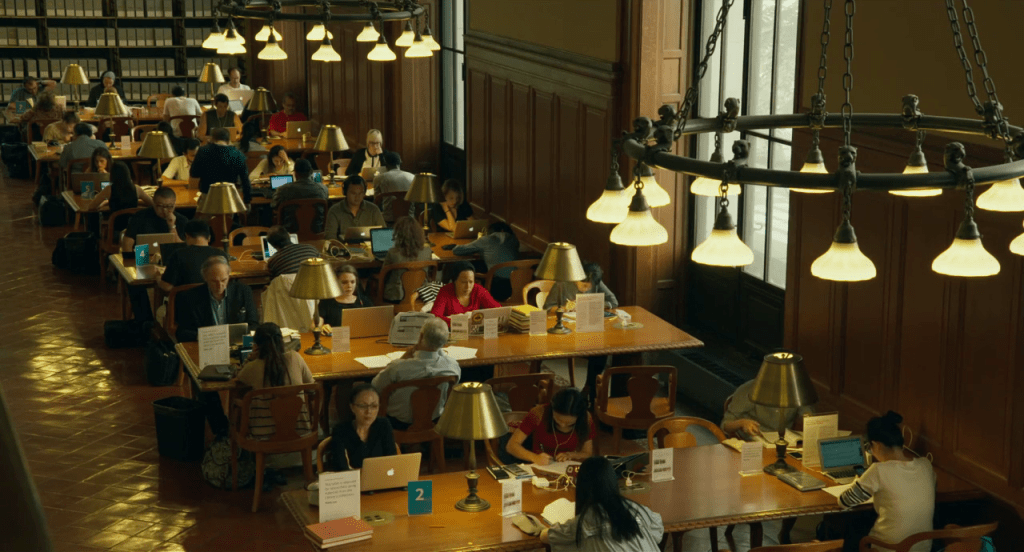 En sus 197 minutos de duración, Wiseman capta las innumerables facetas de la biblioteca en las distintas sedes que posee a lo largo y ancho de toda la ciudad. A través de múltiples escenas, somos testigos de reuniones internas sobre financiación y estrategias digitales, la gestión de servicios comunitarios como apoyo educativo, acceso a tecnología o programas sociales y diversas actividades culturales como lecturas, conciertos, talleres, debates… Wiseman muestra, en definitiva, cómo una institución cultural puede ser un motor de igualdad, educación y cohesión social en pleno siglo XXI.