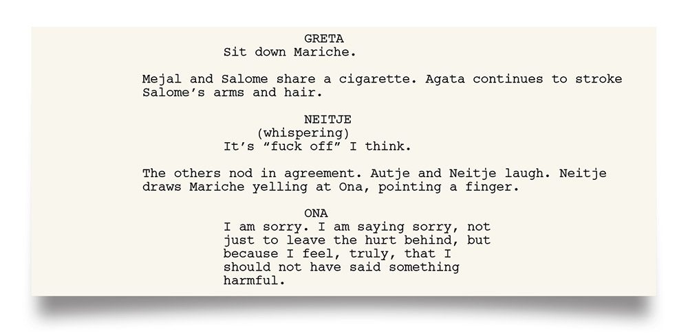 Tenía un miembro del equipo que, según sabía, había sufrido muchos abusos de niño. Rodamos la escena, miré a esta persona, que había tenido una reacción muy fuerte, y le pregunté: «¿Te parece bien?». Y me respondió: «No, la verdad es que no». Me acerqué a Sheila McCarthy (Greta) y le dije: «Esto tiene que centrarse por completo en Mariche y en su experiencia emocional actual. Así que contén las emociones. Si al final sientes que estás conteniendo demasiado, di «Lo siento», pero solo si es necesario». Al final, se derrumbó. Dijo «Lo siento» tres veces. Fue una experiencia colectiva increíble, y se sintió como la culminación de las experiencias de muchas personas convergiendo en este momento de la escritura.